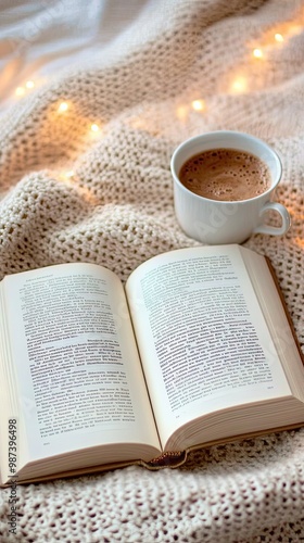 Enjoy a peaceful winter moment with an open book, a warm cup of coffee, and a soft blanket, all surrounded by twinkling lights for a cozy atmosphere