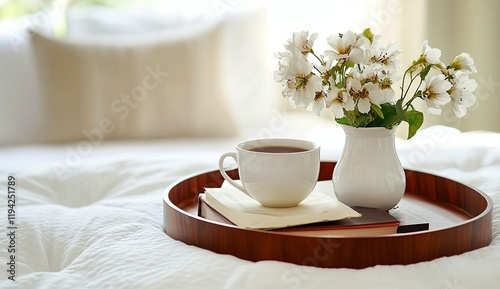 Enjoy a Relaxing Morning: Sip Tea, Read Books, and Appreciate White Flowers on a Wooden Tray in Bed