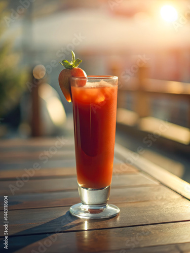 bloody, mary, cocktail, brunch, cafes, drink, garnish, strawberry, refreshing, wooden, table, relaxing, sunshine, beverage, close, party, leisure, weekend, glasses, red, delicious, savoury, tomatoes, juice, vodka, spice, ice, bar, afternoon, enjoyment, favor, social, morning, culture, dining, setting, eatery, citrous, colours, taste, hospitality, summer, food, presentation, garnishing, life events, profile, aesthetic