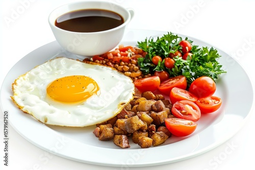 breakfast, fried, egg, roasted, potato, salad, hot drink, healthy, food, nourishment, meal, cookery, morning, delicious, fresh, plate, white, background, protein, balanced, diet, brunch, cooked, yolk, tomatoes, greener, parsley, dietary, eating, cafes, eatery, homemade, culinary, dish, full, sunny, side, up, start, day, energy, promoting, vibrant, appetising, wholesome, photo, isolated, simple, drink