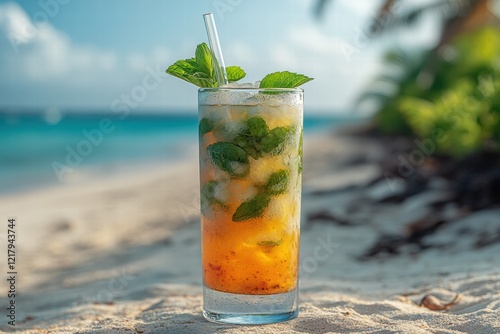 Enjoying a refreshing mojito on a sunny beach with clear blue waters and a gentle breeze