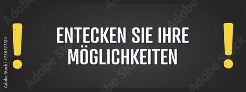 Entecken sie ihre Moeglichkeiten. Eine schwarze Tafel mit weissem Text. Illustration mit Grunge Textstil.