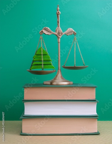 environmental law concept illustration, with symbols of the scales of justice and a judge's gavel placed on top of an open book. generative ai