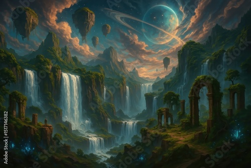 Epic Fantasy Landscape Digital Game Art Featuring Mystical Floating Islands Cascading Waterfalls and Ancient Ruins Under a Dramatic Sky Perfect for Gaming Wallpapers