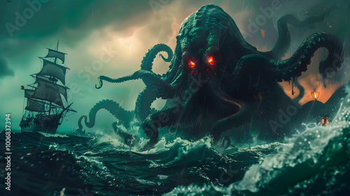 Epic fantasy scene featuring a massive Kraken-Cthulhu rising from the ocean, attacking a ship in stormy seas. Perfect for horror-themed backgrounds with dark, ominous atmosphere and sea monsters