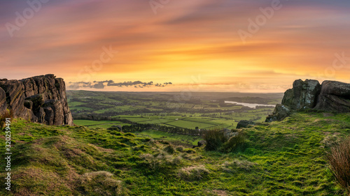 Epic Peak District Winter landscape of view from top of Hen Cloud over countryside and towards Tittesworth Reservoir