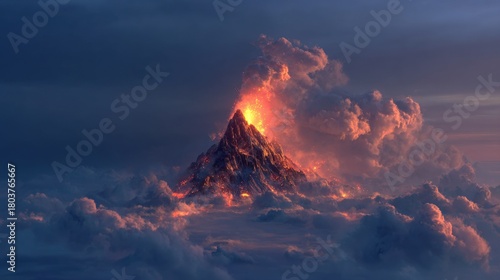 Erupting volcano at twilight surrounded by vibrant clouds displaying fiery lava and smoke during a dramatic sunset in a remote landscape