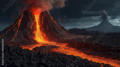 Erupting volcano with glowing lava river at night