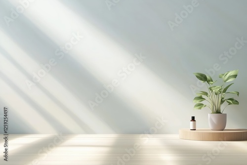 Espaço minimalista com luz natural projetando sombras dramáticas, apresentando um pódio simples e elementos decorativos sutis, criado com IA generativa