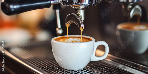 Espresso machine brewing fresh coffee with latte art in a cup, ideal for cafe and barista concepts.