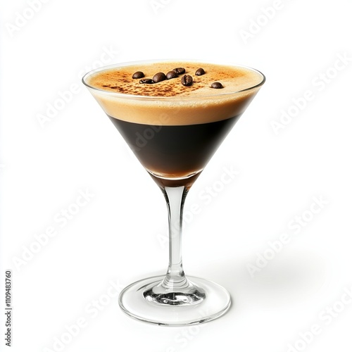 Espresso martini served in a sleek conical glass with a frothy layer and coffee beans on top, emphasizing its rich and smooth presentation against a minimalist background