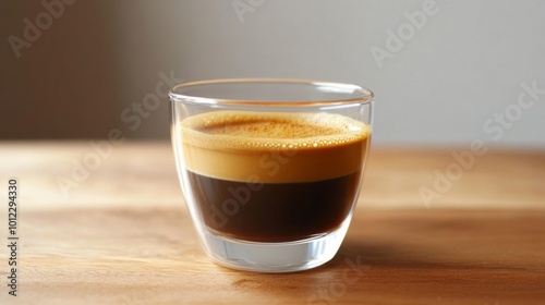 Espresso shot with a layer of crema, in a small transparent cup, minimalist coffee setup generative ai