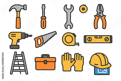 construction, tool, hammer, screwdriver, wrench, plier, drill, saw, tape, measure, level, ladder, toolbox, glove, helmet, safety, gear, bricolage, equipment, hand tool, manual, hardware, utility, repair, maintenance, building, industry, work, engineering, carpenter's shop, protection, blueprint, vector, icon