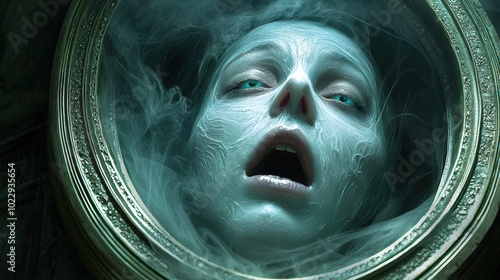 apparition, anguish, emergence, mirror, eerie, surreal, ghostly, face, nightmare, emotion, expression, horror, fog, pale, haunting, supernatural, mysterious, aethereal, chilling, sorrowful, vision, beauty, captivating, art, photo, concept, creative, dramatic, fantasy, intriguing, mystique, light, shadow, spirituality, symbolism, narrative, silence, mystery, surrealism, depth, detail, atmosphere, artful