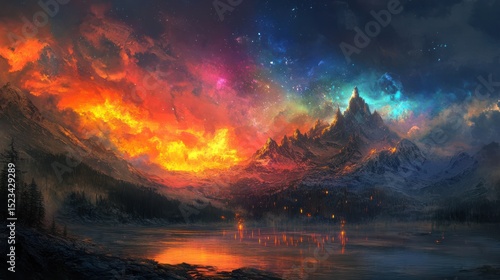 landscape, mountain, sky, cloud, water, star, galaxy, night, dusk, celestial, aurora, aethereal, cosmic, vibrant, colourful, dreamy, fantasy, majestic, scenic, tranquil, mystical, illuminated, picturesque, panorama, nature, outdoors, horizon, distance, peaceful, serene, starlight, twilight, radiance, luminescence, shimmer, glimmer, glow, vista, expanse, perspective, composition, art, painting, digital, illustration, background