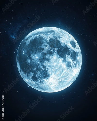 Ethereal full moon glowing in the dark space night sky with stars celestial body lunar surface craters