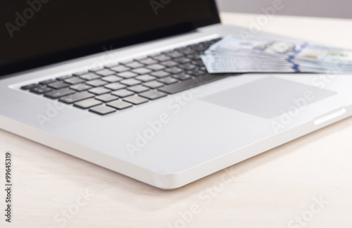 E-Trade and E-Commerce Ideas and Concepts. Stack of Banknotes on Laptop