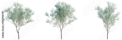 Eucalyptus polyanthemos tree, front view, cutout, transparent background, isolate, architecture visualization, Three lush green trees with delicate foliage, perfect for spring or summer scenes