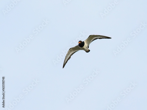 Eurasian Oystercatcher in Flight Against Clear Blue Sky