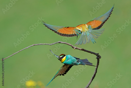 chasing, flying, tree branch, courtship, animal, bokeh, closeup, colourful, east europe, summer, bird, bee-eater, europa, landscape