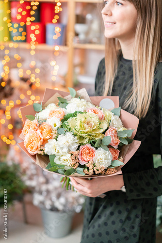 European floral shop. Beautiful bouquet of mixed flowers in womans hands. the work of the florist at a flower shop. Delivery fresh cut flower.