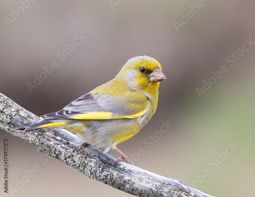 European Greenfinch, Chloris chloris. A bird sits on a branch and looks into the distance