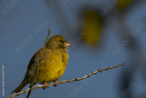 greenfinch, blue skies, summer, animal, background, beautiful, birding, tree branch, colours, colourful, cute, detail, environment, fauna, avian, bird, finch, female, isolated, copy space, nature