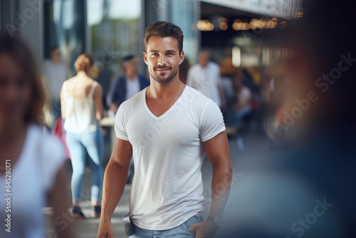 European Man Walking in Modern City, Handsome Europe Guy Walks on a Crowded Pedestrian Street.