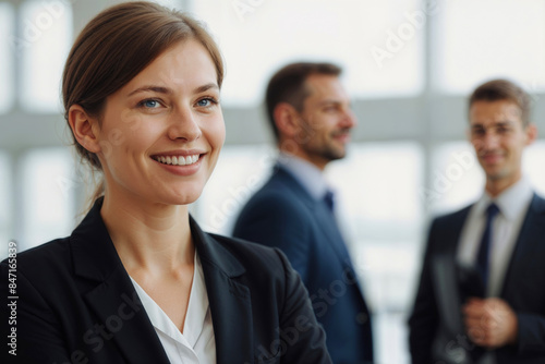 European woman in a business suit is smiling at the camera. She is surrounded by two men in suits