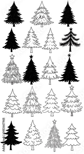 christmas, tree, tree, fir, pine, evergreen, silhouette, outline, vignetting, drawing, illustration, graphic, design, element, holiday, season, decoration, symbol, image, collection, set, vector, artwork, black, white, simple