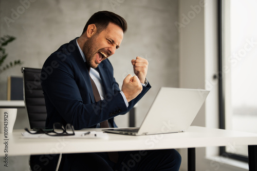 smile, celebrate, victory, suit, career, adult, attractive, business, businessman, computer, confident, employee, entrepreneur, excited, executive, happy, job, laptop, leader, looking, male, man, manager, office, people