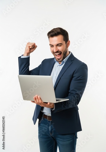 success, celebration, businessman, laptop, achievement, victory, joy, happiness, winning, business, technology, computer, office, work, professional, male, caucasian, white background, studio shot, excited, enthusiasm, optimism, goal, accomplishment, good news, positive, smiling