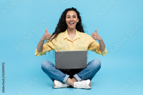 online, laptop, woman, thumb up, approve, technology, happy, computer, isolated, modern, freelance, website, freelancer, sitting, using, digital, arab, browsing, gesture, lady, cyberspace, work, middle eastern, caucasian, advertisement, 1, websurfing, business, people, studio, arabic, female, young, background, banner, person, contraption, smile, concept, posing, distance, adult, blue, like, device, feminine, remote