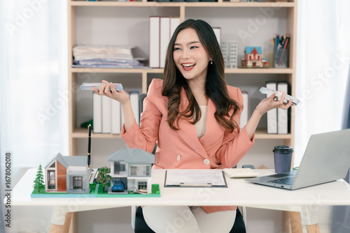 Excited young Asian real estate agent sells her house for investment and offers business and finance presentations.