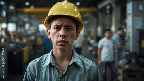Exhausted young worker in a helmet and shirt showing signs of distress in a factory environment with blurred coworkers in the background