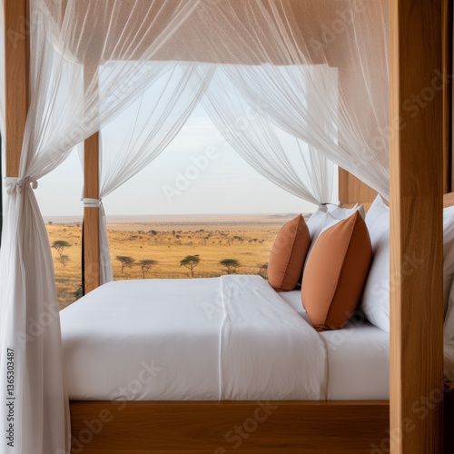 luxurious, hotel, room, bed, view, landscape, soft, linen, scenic, african, invite, relaxation, travel, light, rustic, deluxe, ambience, modern, retreat, comfort, set, culture, bedchamber, nature, wildlife, decor