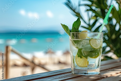 Exotic summer cocktails sandy beach in the background