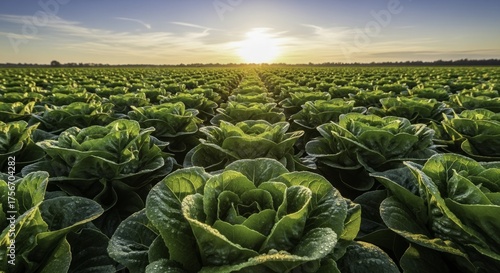 Expansive field of vibrant green lettuce with shimmering dew drops at sunrise, under a clear sky, highlighting fresh produce and the beauty of agriculture.