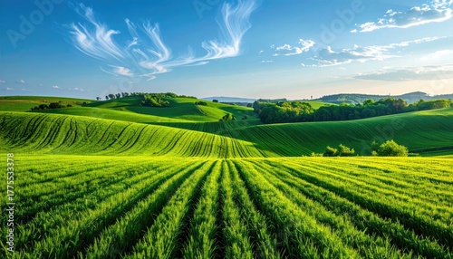 landscape, nature, scenic, countryside, hill, green, sunlight, daylight, vale, agriculture, farm, field, rural, outdoors, sky, cloud, blue skies, wispy clouds, summer, spring, serene, peaceful, tranquil, beauty, majestic, grandeur, pastoral, horizon, light, lighting, natural light, sun ray, crop, growth, fresh, vibrant, lush, open space, wide view, huge