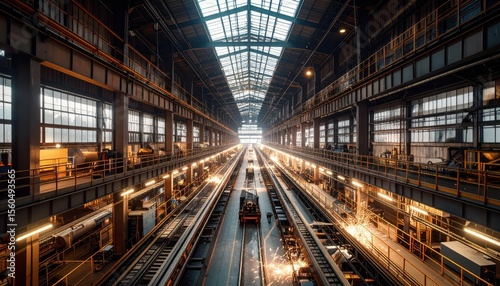 warehouse, conveyer, belt, glasses, ceiling, strobe, effect, spark, industrial, lighting, machinery, futuristic, technology, rail, line, ambience, workspace, design, wide, angle, perspective, illumination, creative, engineering, architecture, production, equipment, retro, aesthetic, dynamic, shine, shadow, detail, environment, innovation, metal, structure, vibrant, contrast, depth, visual, scene, energy, atmosphere, dramatic, space