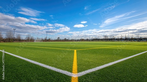 soccer, field, sport, turf, green, sky, cloud, yellow, line, empty, landscape, recreation, bright, perspective, goal, sunny, competition, play, activity, nature, vibrant, athletic, training, life events, summer, football, clear, scenic, environment, roomy, surface, game, line, physical, energy, leisure, open, relaxing, huge