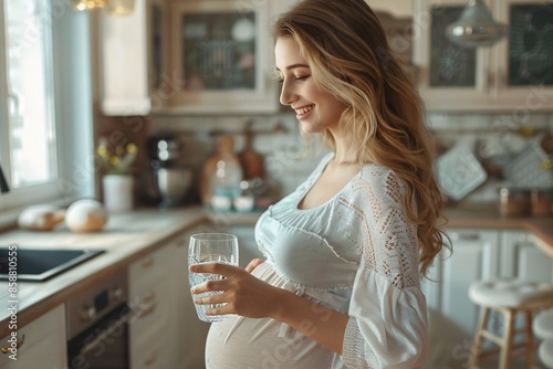 Expectant female holding a cup of water in the kitchen.