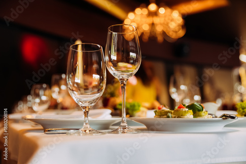Experience diverse dishes from Ukrainian to Japanese cuisine in an elegant dining setting with fine glassware at a restaurant