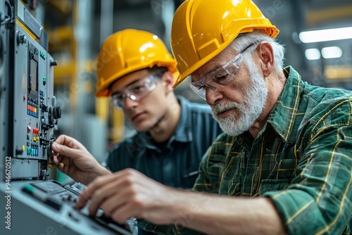factory, industrial, machinery, engineer, apprenticeship, teamwork, collaboration, hard hat, safety-gear, control panel, buttons, lever, manufacturing, production, mill-hand, blue-collar, plant, maintenance, men at work, industry, learning, mentor, experienced, apprentice, future, profession, career, operation, equipment, machine, technician, workplace, training, professional, serious, focused, concentrated, dedicated, job