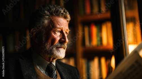 Experienced investor reading financial news in a contemplative mood, elegant study