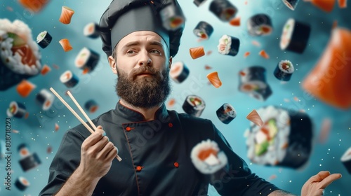expert asian chef demonstrating sushi technique with flying sushi and chopsticks