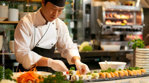 expert, chef, preparing, sushi, precision, culinary, art, high-end, epicure, kitchen, traditional, food preparation, professional, cooking, closeup, plating, delicate, artistry, seafood, eatery, authentic, cultural, elegant, meticulous, technique, flavorful, raw fish, rice, nori, sashimi, wasabi, soy sauce, experienced, focused, food photography, artistic, creativity, appetising, delicious