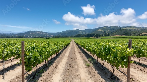 Explore the breathtaking beauty of vineyards nestled in rolling hills under a bright blue sky