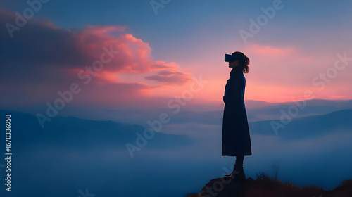 explorer, standing, datum, terrain, watching, digital, sunrise