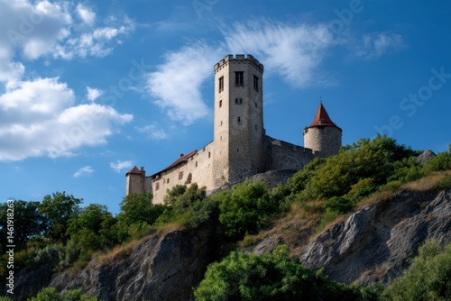 castle, building, tower, fortress, architecture, hill, mediaeval, stone, defense, sky, cloud, landscape, tree, exterior, landmark, old, travel, history, heritage, tour tourism, ancient, destination, vacation, countryside, rural, mountain, fortification, structure, rock, cliff, european, day, scene, view, sight, visit, observing, exploring, climbing